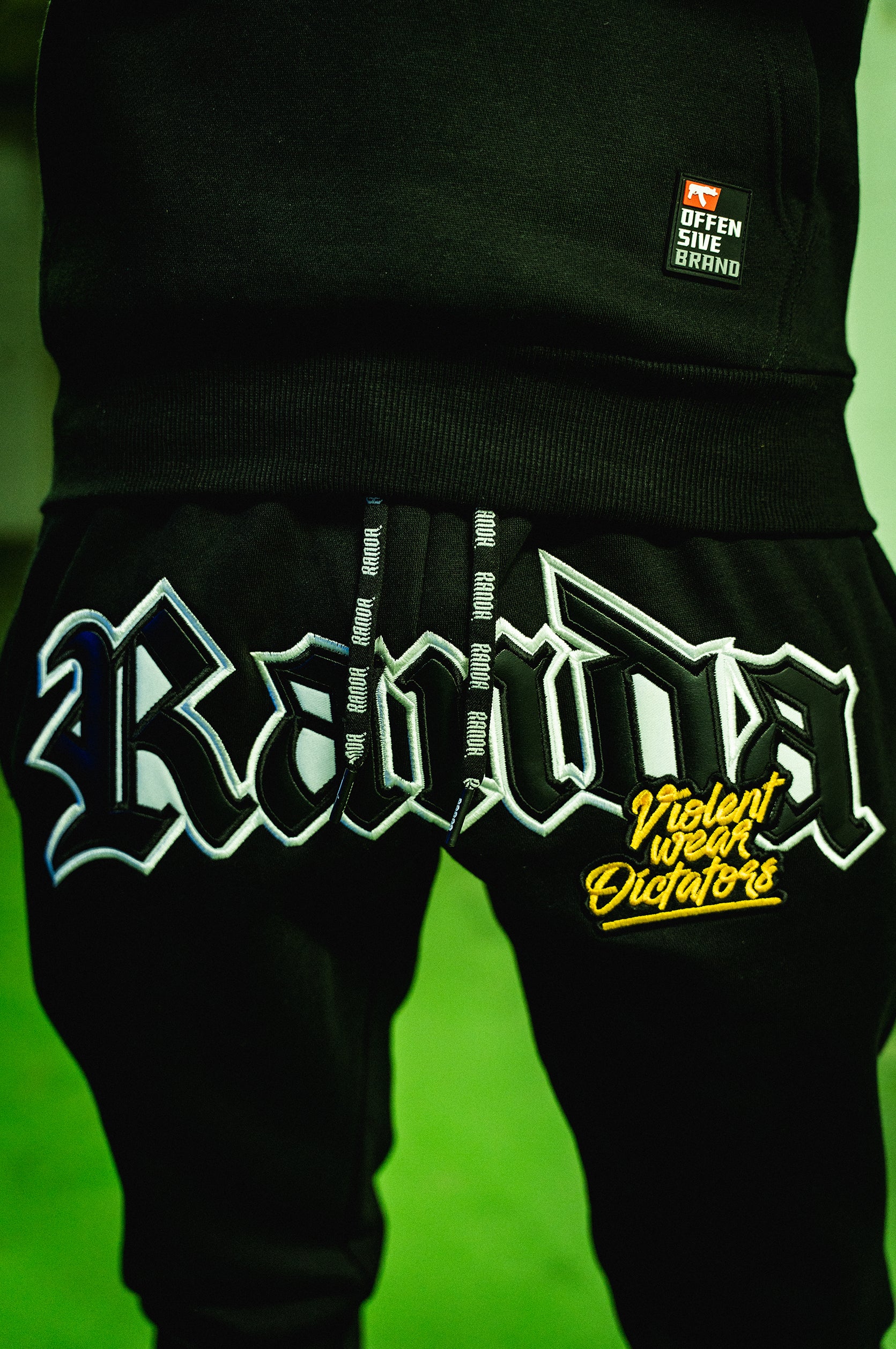 Chándal 100% algodón negro de alto gramaje. Nueva técnica de doble applique con efecto cuero negro con bordado superpuesto tanto en el pecho como en el frontal del pantalón. Detalle mini ak47 bordado en el bolsillo de la hoodie. Espalda con doble applique gigante y applique cuero negro con bordado blanco. Serigrafía en el interior de la capucha. Cordones con nuestro logo. Incluye bolsillos con nuestras cremalleras plateadas con grabado negro en ambas caras, todos los etiquetados clásicos de nuestra marca y nuestro packaging.