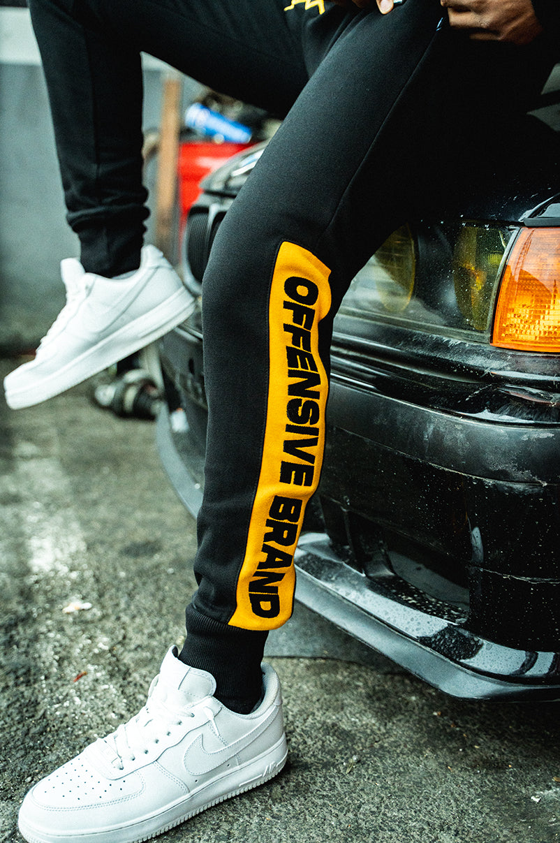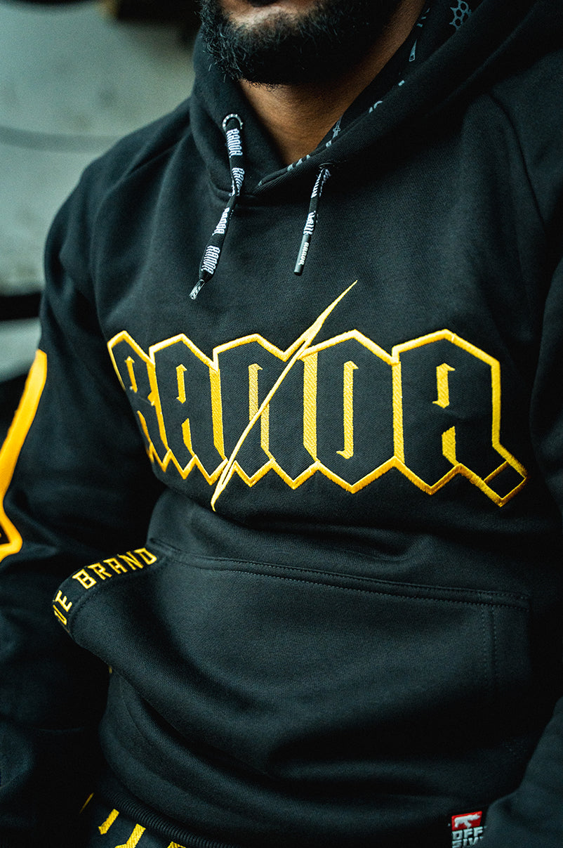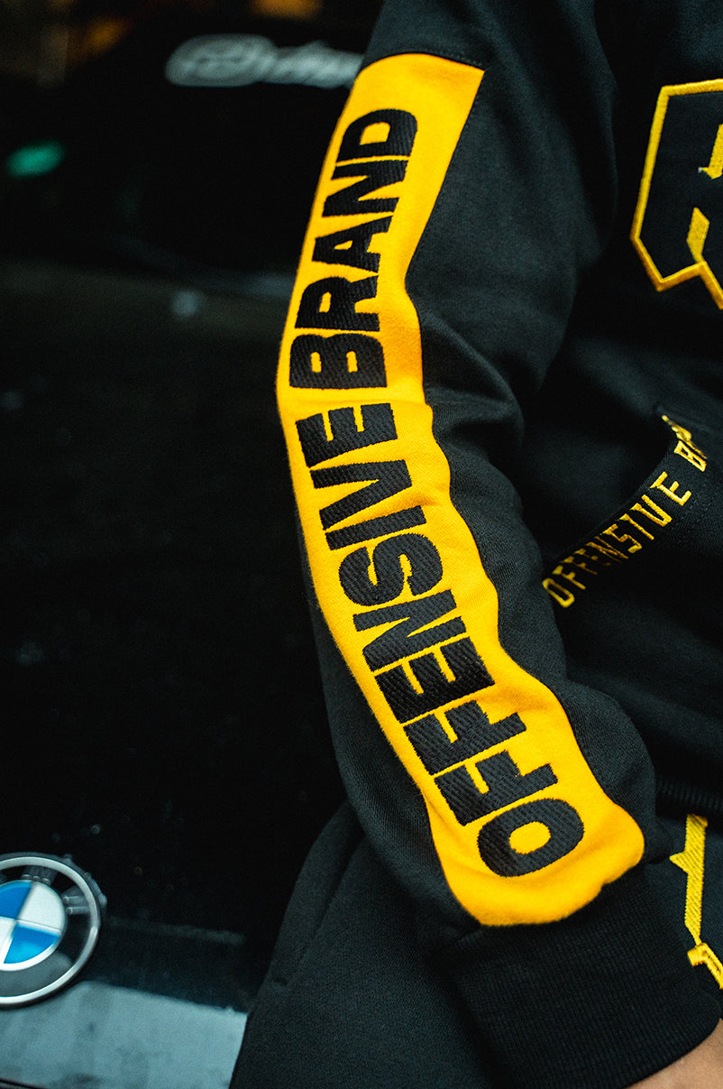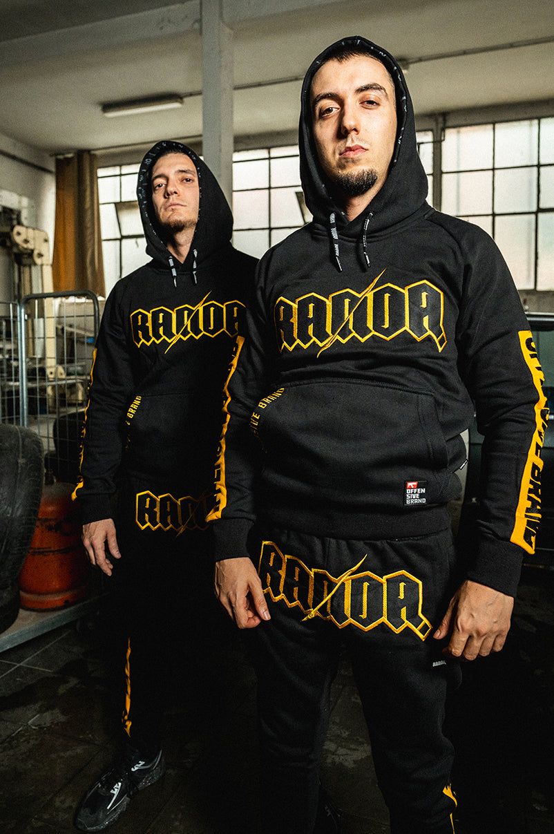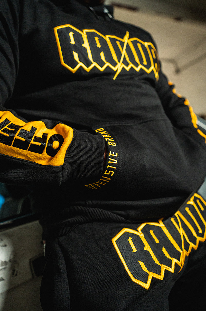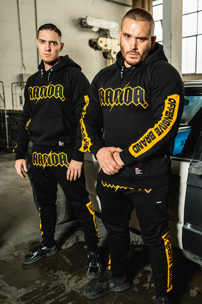 Chándal 100% algodón negro de alto gramaje. Combinación de applique negro y bordado amarillo en la parte frontal de la sudadera y del pantalón, paneles de algodón amarillo con bordados en negro en las mangas y piernas y bordado amarillo en el bolsillo de la hoodie. Serigrafía en el interior de la capucha. Cordones con nuestro logo. Incluye bolsillos con nuestras cremalleras plateadas con grabado negro en ambas caras, todos los etiquetados clásicos de nuestra marca y nuestro packaging.